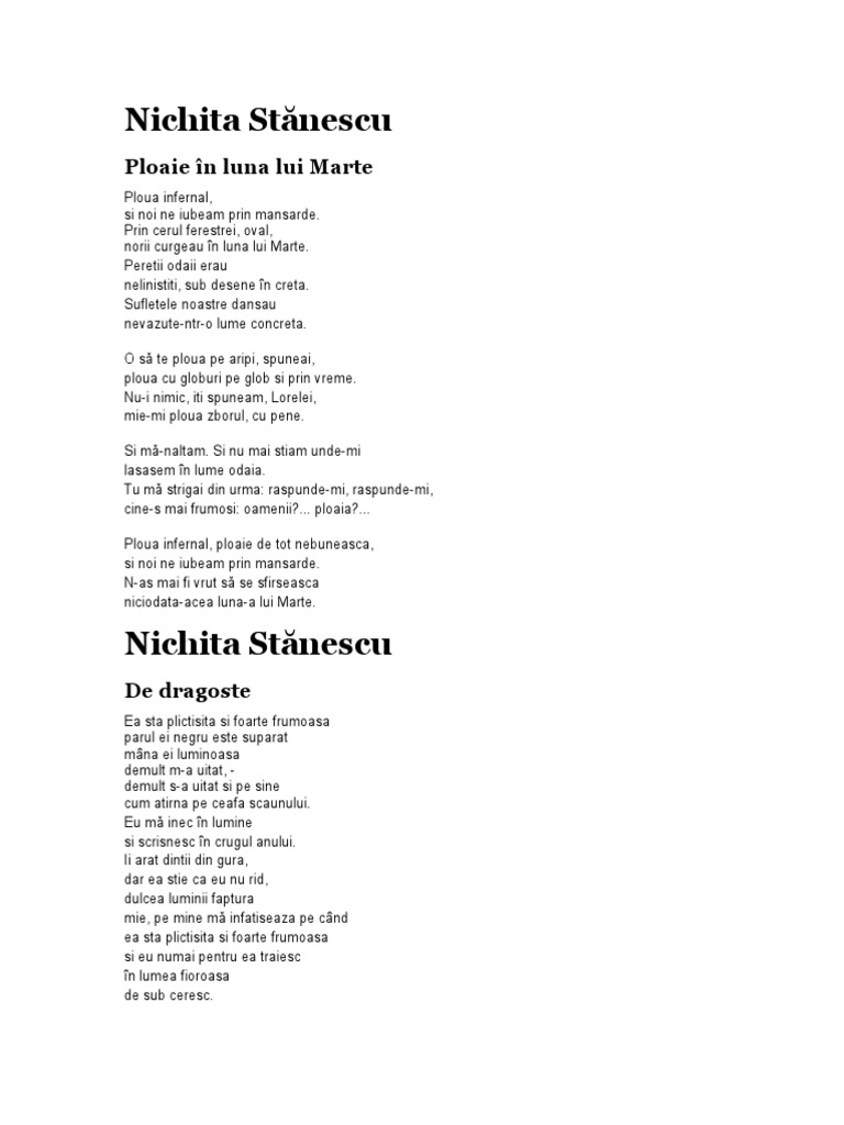 De Dragoste Source from : https://ru.scribd.com/doc/250244380/De-Dragoste Asculta poezia de dragoste, de pe albumul o recitare, interpretata de nichita stănescu. Plină de înţelesuri, de sensuri… am cunoscut cu ani în urmă pe un prieten al lui nichita. Suntem convinse ca vor fi o incantare pentru voi! Ea stă plictisită şi foarte frumoasă părul ei negru este supărat mîna ei luminoasă demult nichita fascinează mereu prin poezia lui. Ca o nichita stănescu este mai interesat, mai emoţionat de idee decât de sentiment.