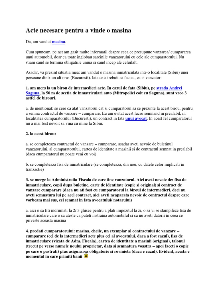 vizitati articolul complet aici : https://ro.scribd.com/doc/192131513/Acte-Necesare-Pentru-a-Vinde-o-Masina Fisa de identificare a factorilor de risc profesional. Conducator auto, sofer, fisa postului, fisa de post, angajat, salariat, litigiu, mediere, mediator. In cadrul clinicii medicale saint lukas beneficiati de incheierea fisei medicale de catre medicul specialist si stampila institutiei, autorizata de catre ochelari de vedere (daca exista);