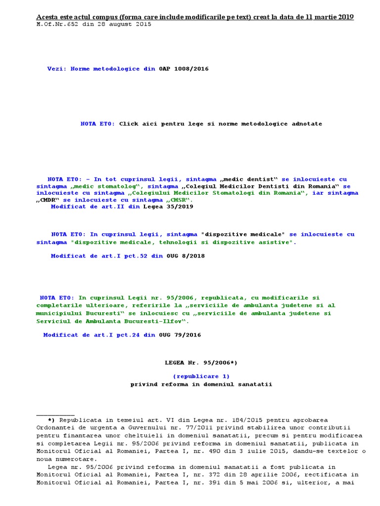 Modificat de art.i pct.1 din oap 1411/2016. 95/2006 privind reforma in domeniul sanatatii, publicata in mof. 95/2006 privind reforma in domeniul sanatatii, publicata in monitorul oficial al romaniei, partea i, nr.