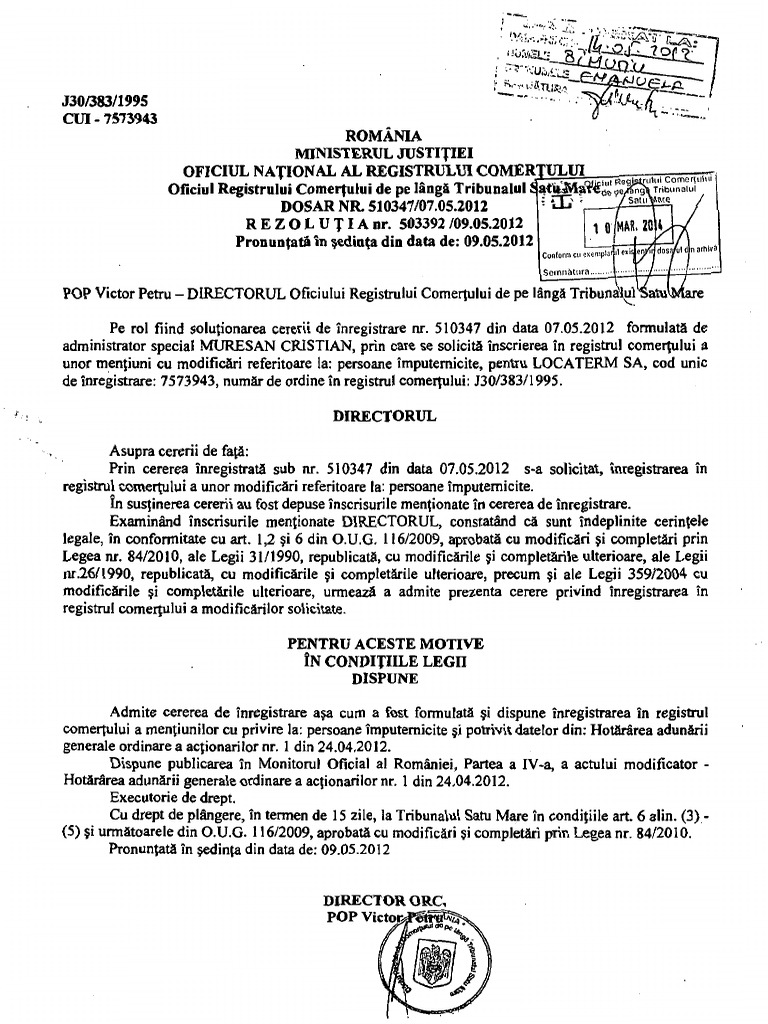 Satu mare avand numarul de ordine in registrul comertului j30/3i03.01.1996, cif 8024439, reprezentata de administrator pop vasile, cnp 1720716301014, domiciliat in satu mare, str.